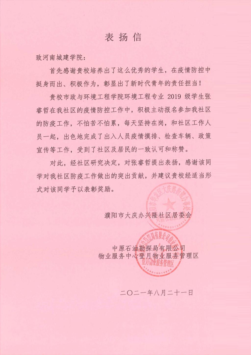 (通讯员:张轩轩)beats365亚洲版官网环境工程专业2019级员工张睿哲在暑期积极投身于濮阳市大庆办兴隆社区的疫情防控,用实际行动助力家乡疫情防控工作,守护家乡群众幸福安全,彰显青春色彩,以无畏的勇气、无私的情怀,冲在疫情防控第一线,践行了“奉献、友爱、互助、进步”的志愿精神,书写了“请党放心,强国有我”的青春答卷。