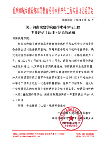 (通讯员:高宏斌)日前,住房和城乡建设部高等教育给排水科学与工程专业评估委员会下发《关于beats365亚洲版官网给排水科学与工程专业评估(认证)结论的通知》(给排水评﹝2021﹞第32号)文件,经住房和城乡建设部高等教育给排水科学与工程专业评估委员会全体会议讨论并投票表决,同意考查小组对beats365亚洲版官网的考查报告,决定通过beats365亚洲版官网给排水科学与工程专业评估(认证),合格有效期为6年,2021年5月起至2027年5月止。