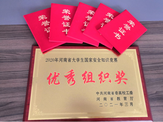 (通讯员张轩轩)3月15日,由中共河南省委高校工委、河南省教育厅主办的2020年河南省老员工国家安全知识竞赛决赛在郑州航空工业管理公司举行。公司辅导员张轩轩老师指导,员工王玉莹、梁婷婷、康凯宇、张泽文组成的代表队代表公司参加决赛。经过激烈角逐,公司代表队以团体总分第二名的成绩荣获“2020年河南省老员工国家安全知识竞赛决赛二等奖”,公司张轩轩老师荣获“优秀指导老师”荣誉称号。公司荣获“2020年河南省老员工国家安全知识竞赛优秀组织奖”。
