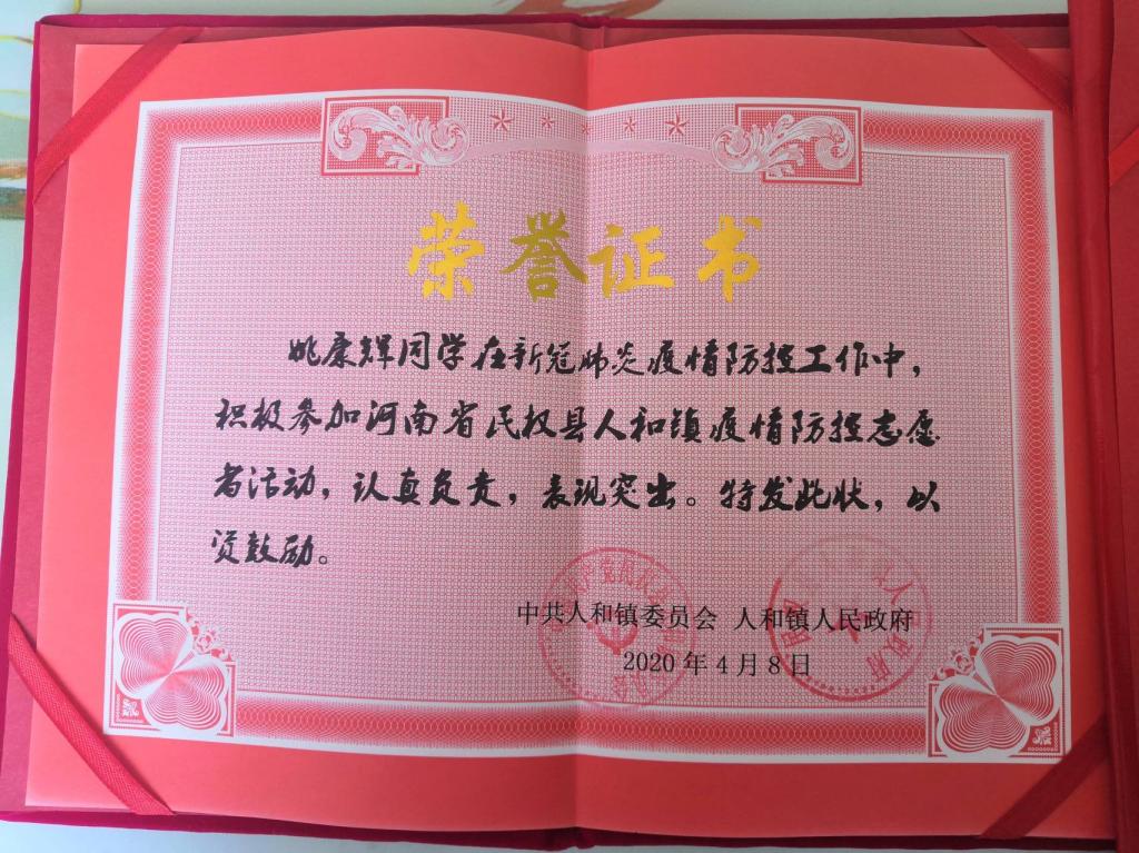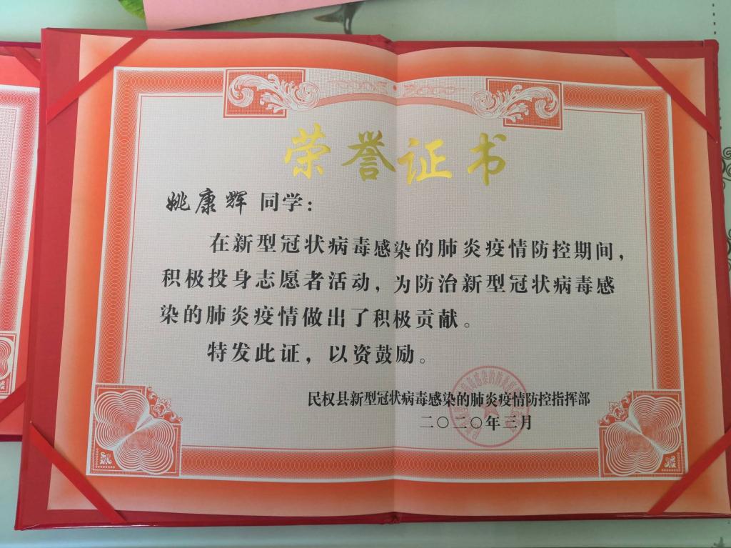 疫情就是命令,防控就是责任。自新冠病毒肺炎疫情发生以来,该同学积极参加当地疫情防控志愿服务队,冲锋在前,战斗在“疫”线,在抗击疫情的战场上充分发挥出生力军和突击队的作用,用担当奏响青春凯歌。