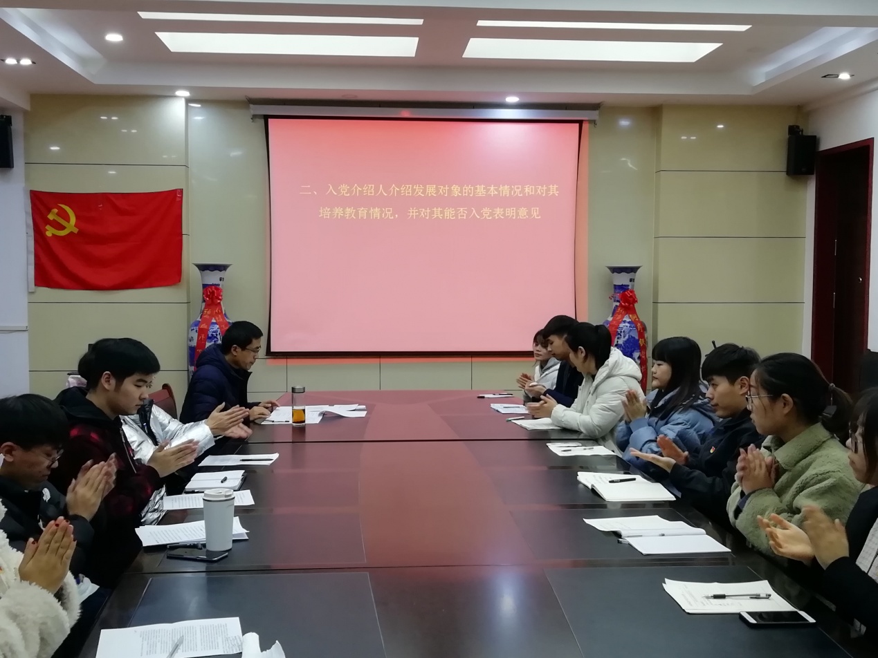 按照接收新党员程序,贺攀等十一位同学分别宣读入党志愿、汇报自己对党的认识、入党动机及有关情况;之后由发展对象介绍人分别向大会报告十一位同学培养考察情况,对其能否入党表明态度;支委会向大会报告对发展对象的审查情况,并就能否入党表明态度;经过支部党员充分讨论及不记名投票表决,一致同意贺攀等十一位同学加入中国共产党。