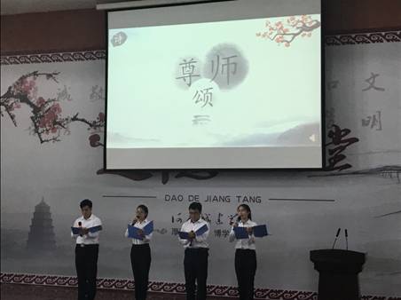 讲堂在全体到场师生诵读《孟子·离娄下》中拉开帷幕,主持人带领全场老师向自己发问:“教学过程中是否以生为本”、“日常生活中是否做到助人为乐”和“日常教学中是否践行了社会主义核心价值观”,全体老师闭目沉思60秒,全场肃然。学模范环节,大家一同学习了河南大学最美教师张晓辉的感人事迹,张老师九年时间资助2000名贫困儿童,为贫困学子撑起一片天,生动展示了榜样的品格和道德的力量。看完感人事迹短片,郭一飞经理结合自身教书经历阐述了对 “道”和“德”二字的理解,并要求员工在日常学习和生活中做到“嘴勤”、“眼勤”和“手勤”,不断提高自身道德修养,做一个道德高尚的人,对家庭和社会有用的人。诗咏传诵部分,四位同学深情朗诵《尊师颂》,表达了对老师们辛勤付出的感恩之情。身边人说身边事,身边人说自己事,公司员工刘学亮救落水小男孩的故事也被传为美谈。发善心环节,大一员工李美保同学结合自己受伤及被救助的经历,表达了公司、公司领导老师和同学践行大爱精神的感激之情;田长勋副经理结合自己切身经历,讲述自己以生为本,践行爱心服务工作法,关爱帮助员工,以心换心,同样也收获的员工对老师发自内心的尊敬;陈松涛书记结合自身的工作经历,要求老师们能做的“尊重员工”、“关爱员工”和“相信员工”,不但要教好书,更好育好人,真正做到“以生为本,德艺双馨”。