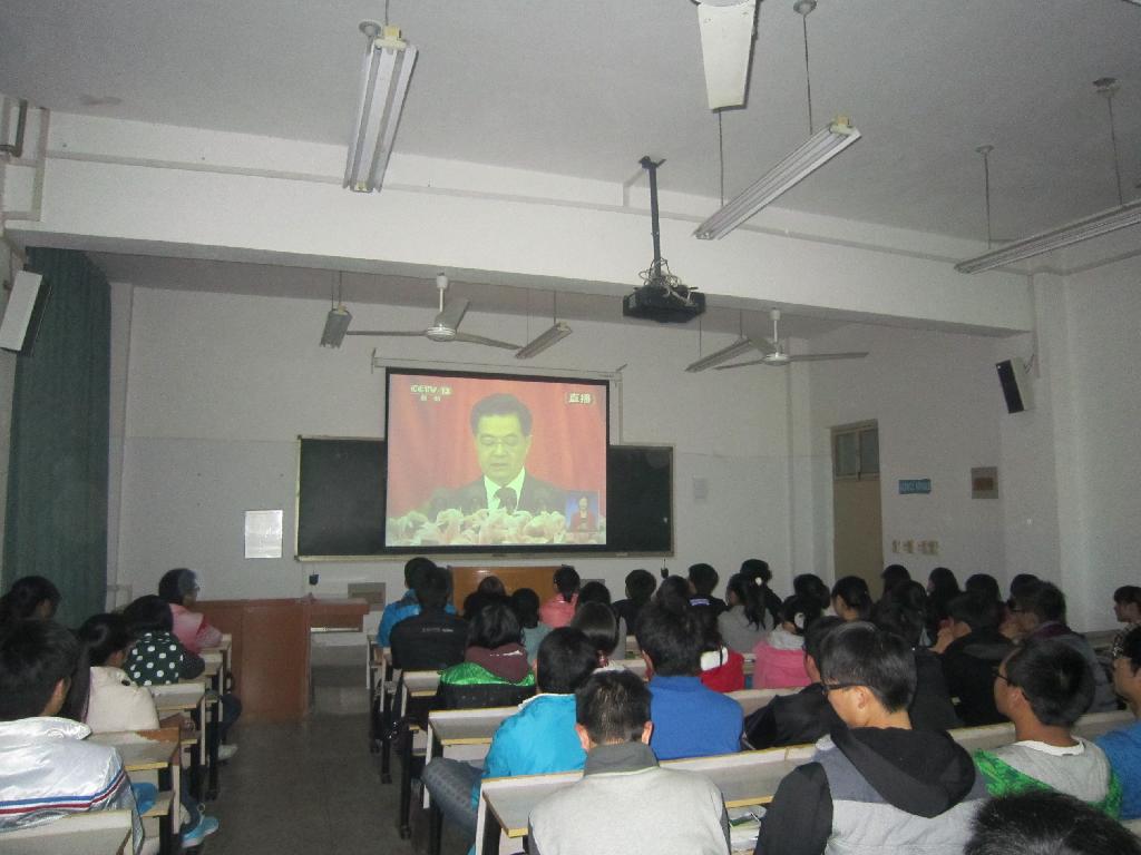 (通讯员:马斌)11月8日上午9点,我系教师代表、员工代表共一百六十人分别在系会议室和9号A-408收看了胡锦涛总书记在中国共产党第十八次全国代表大会上作的题为《坚定不移沿着中国特色社会主义道路前进 为全面建成小康社会而奋斗》的报告。在党的十八大召开前的一段时间以来,环政系的师生们纷纷关注党的十八大筹备情况以及相关的新闻报道。同时,还有许多师生自己就近收听收看现场直播。