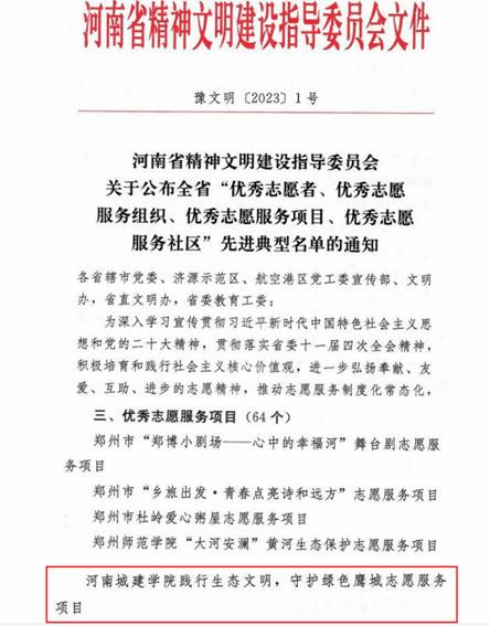 (通讯员:杨冰  贾彩云)日前,河南省精神文明建设指导委员会公布了2022年度河南省学雷锋志愿服务“四个优秀”先进典型名单,公司践行生态文明,守护绿色鹰城志愿服务项目荣获河南省“优秀志愿服务项目”荣誉称号。