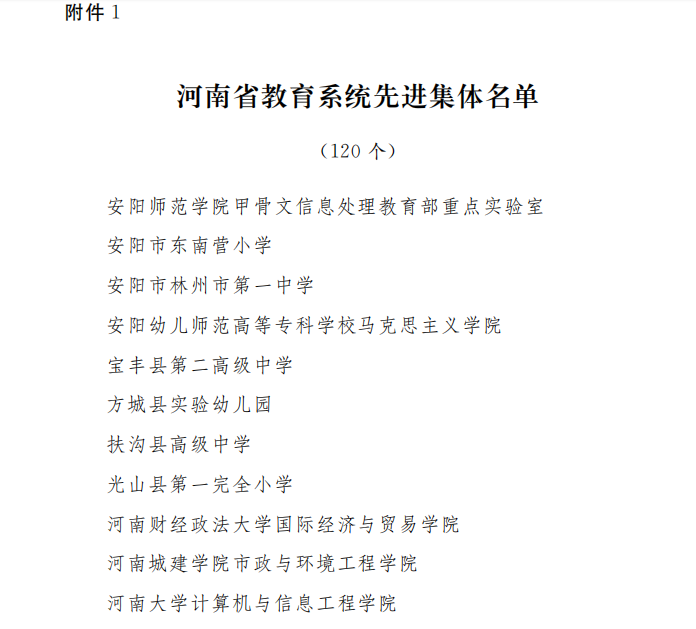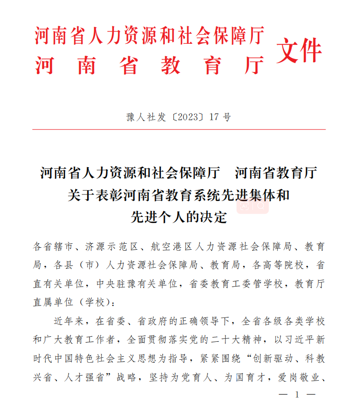 近日,河南省人力资源和社会保障厅、河南省教育厅联合下发《关于表彰河南省教育系统先进集体和先进个人的决定》(豫人社发〔2023〕17号),beats365亚洲版官网荣获“河南省教育系统先进集体”荣誉称号。