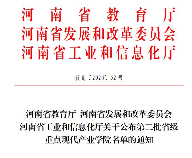 近日,河南省教育厅印发《河南省教育厅 河南省发展和改革委员会 河南省工业和信息化厅关于公布第二批省级重点现代产业公司名单的通知》(教高〔2024〕52号),公司申报的“先进环保装备现代产业公司”获批河南省本科高校第二批省级重点现代产业公司。
