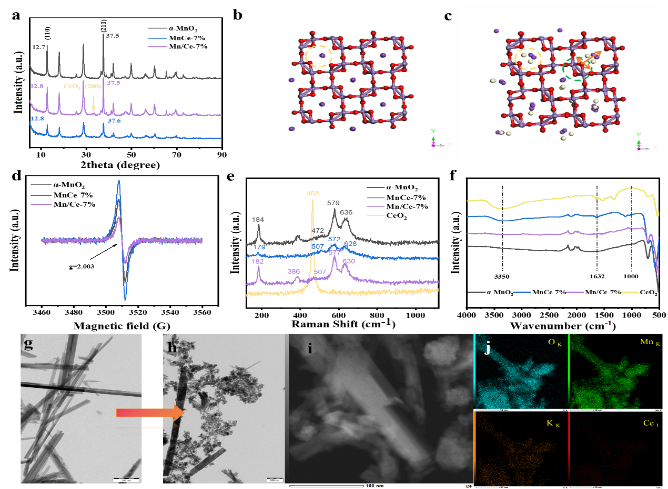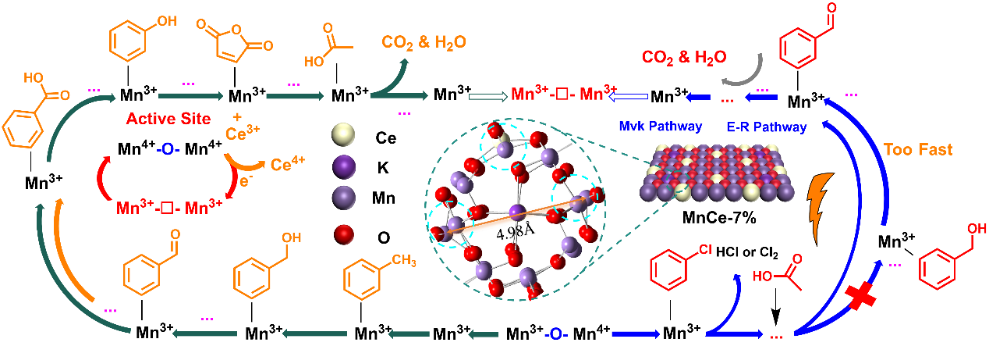 创新点二:明确CeO2在α-MnO2中的取代位置,阐述Ce-O-Ce和Mn-O-Mn在同步净化甲苯和氯苯中的具体作用,明确氧化位点和酸性位点的作用机制。