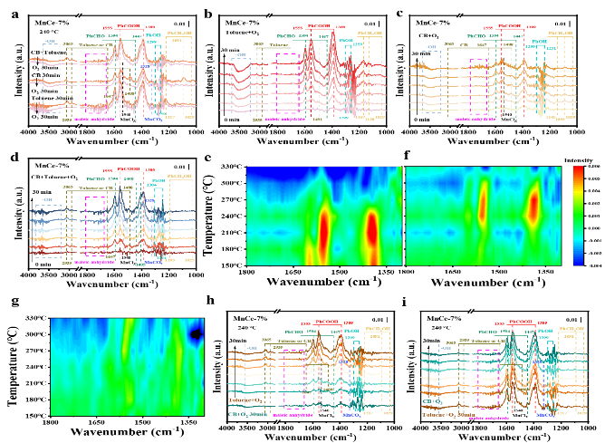 创新点三:采用低温原位DRIFTS实验精准追踪甲苯和氯苯在催化剂上的吸附位点,揭示甲苯和氯苯催化反应机理。