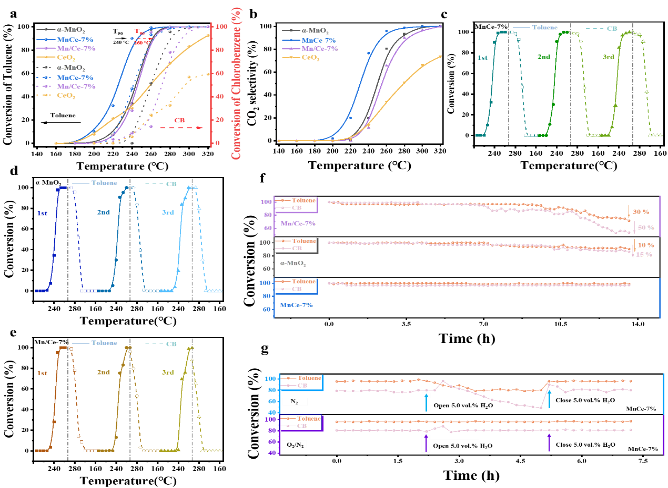 创新点一:向α-MnO2中掺杂CeO2,加强其酸性位点和氧化位点在催化甲苯和氯苯的协同作用机制,解决催化剂同步高效净化多组分VOCs的技术难题。