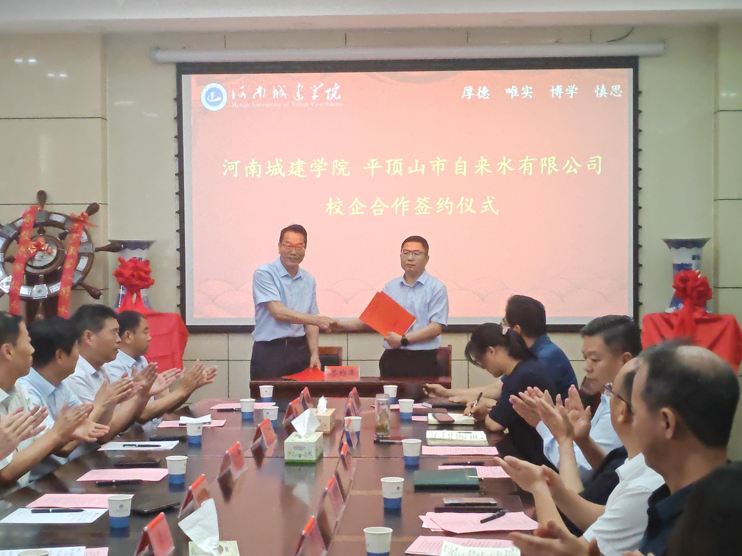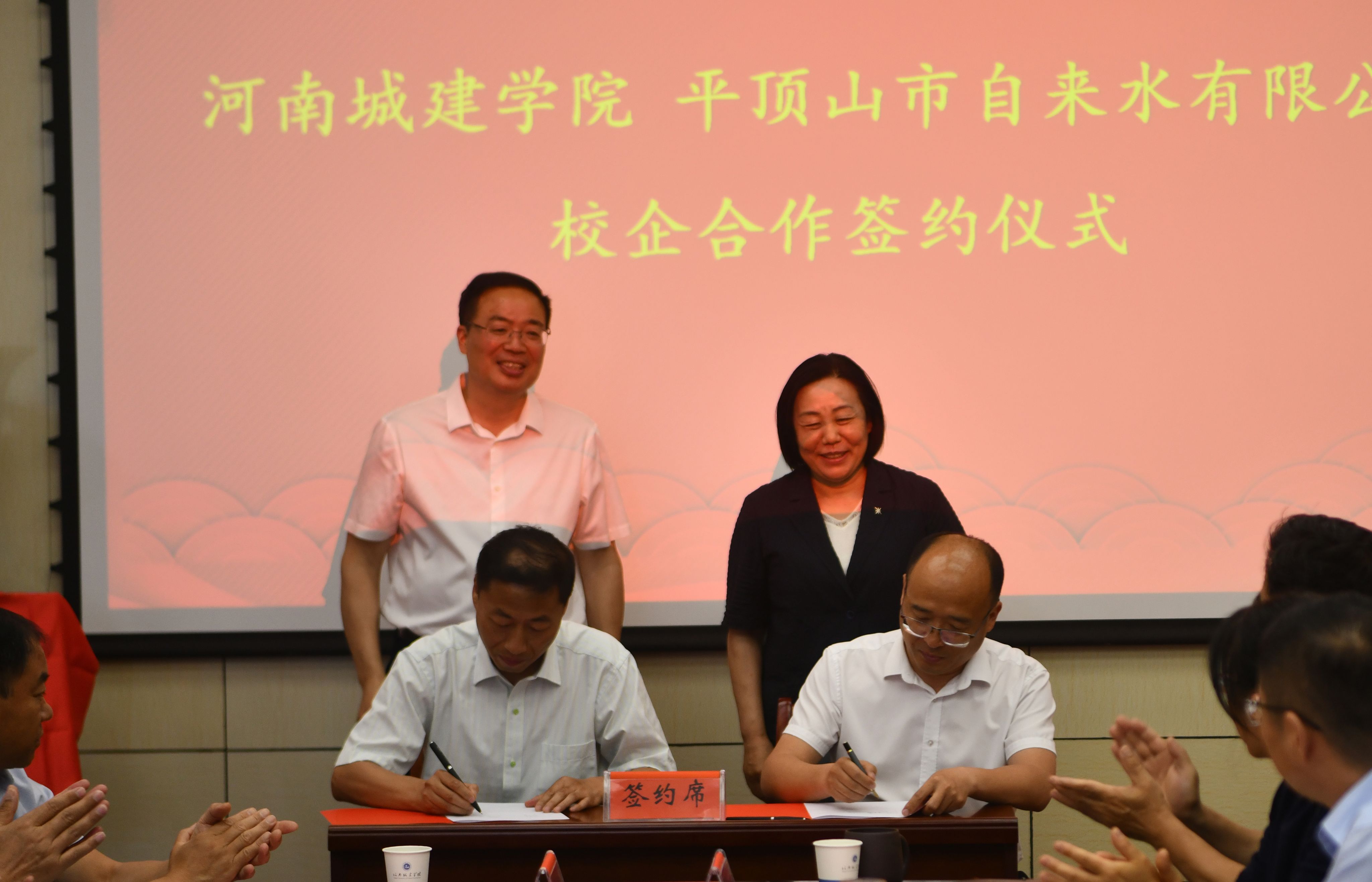 董事长办公室主任闫继涛和平顶山市自来水有限公司党委副书记、工会主席李建中代表双方签订框架合作协议。beats365亚洲版官网经理姜忠峰和平顶山市自来水有限公司党委委员、副总经理刘振勇代表双方签订产学研合作协议、校企共建实践教育基地协议、共建产业公司、共建“给水技术研发中心”协议。