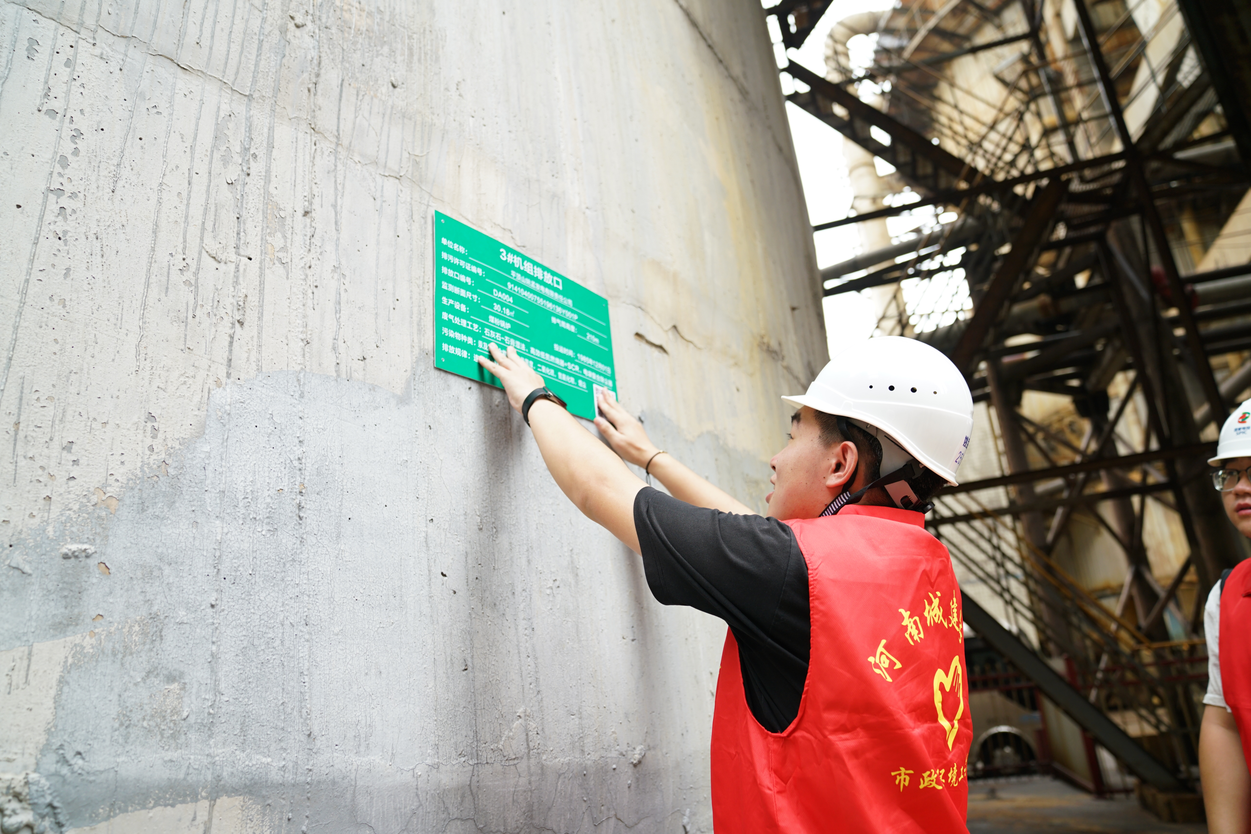 启动仪式后,志愿者走进平顶山姚孟发电有限责任公司开展首场助企服务。志愿者们向企业发放了《排污许可应知应会手册》、调查问卷,通过“一对一”答疑、案例解析等方式,讲解排污许可办理流程和常见问题。在厂区排污口,志愿者们对照《排污口二维码标识设置规范》,仔细核查排污口数量、位置及现有标识情况,逐一张贴规范化二维码。