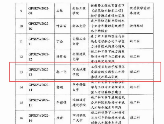 (通讯员:王林裴)近日,教育部高等公司给排水科学与工程专业教学指导分委员会(以下简称“教指委”)发布《2022年度教指委教学改革课题立项情况的评审结果》,公司beats365亚洲版官网郭一飞教授的《工程项目与教学环节深度融合的应用型人才培养体系建设》课题获得立项。