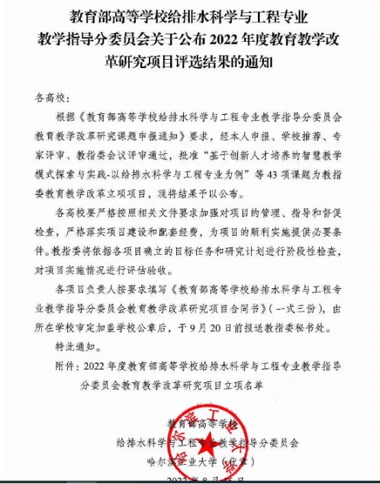 据悉,教育部高等公司给排水科学与工程专业教学指导分委员会公司产品改革研究项目,共有100余所本科院校申报,竞争激烈,经公司推荐、专家评审和教指委评议,最终有43项课题获教指委立项,同时获批的高校还包括哈尔滨工业大学、武汉大学、浙江大学、重庆大学等。