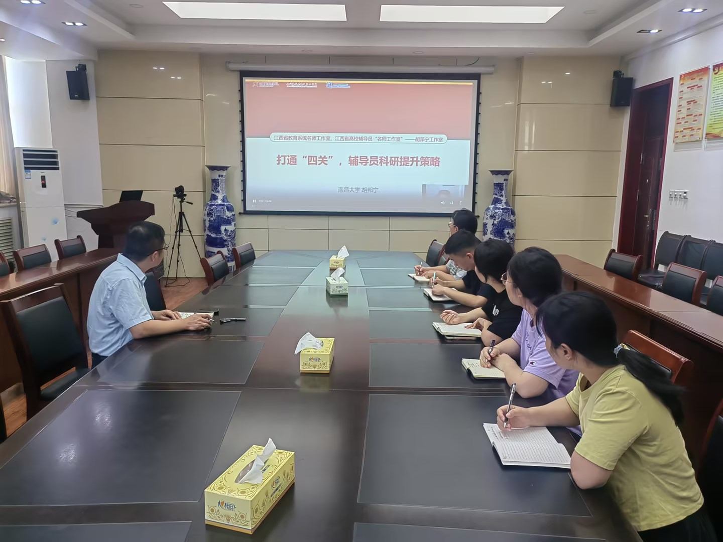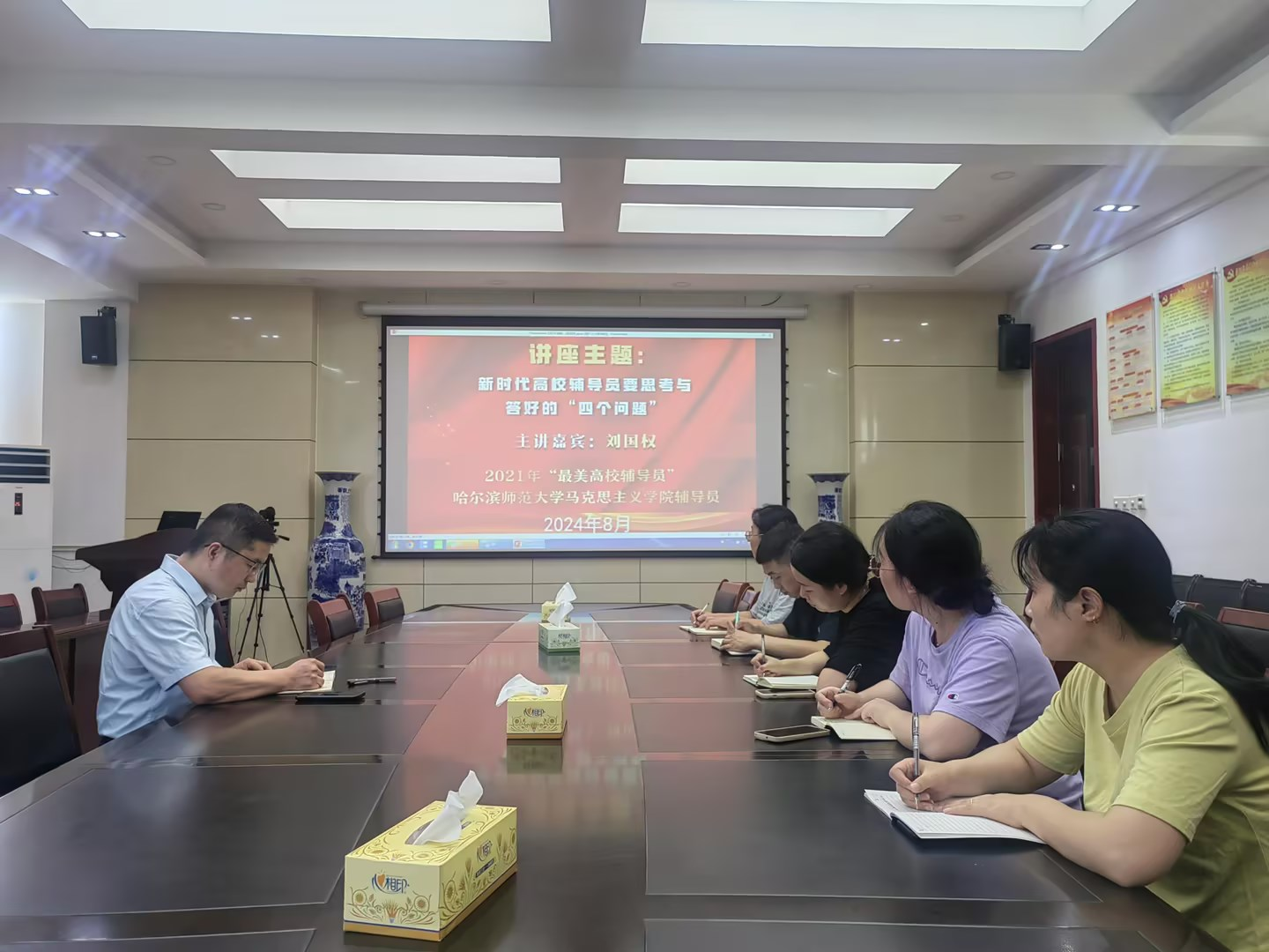 本次培训采取专题学习、案例研讨与工作经验交流相结合的形式。专题学习环节,大家集中观看了全国高校辅导员素质能力大赛一等奖获得者、全国最美高校辅导员、哈尔滨师范大学刘国权所做的《新时代高校辅导员要思考与答好的“四个问题”》,全国最美高校辅导员、南昌大学人文公司党委副书记胡邦宁做的《打通“四关”,辅导员科研提升策略》专题讲座。