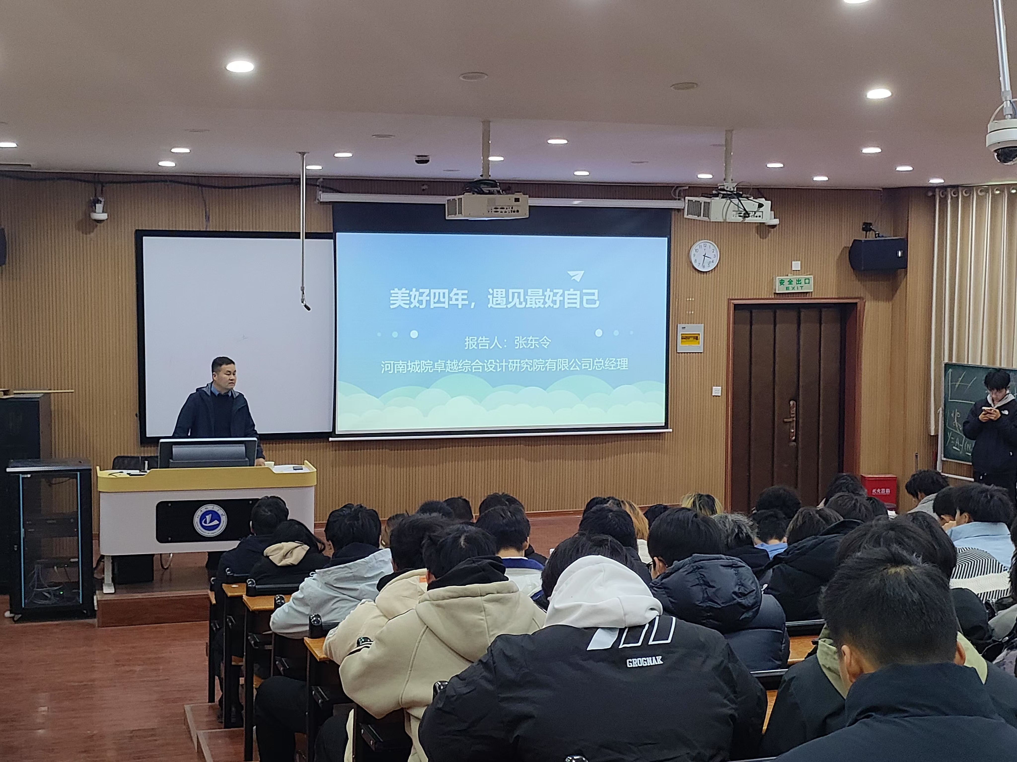 张东令以“美好四年,遇见最好自己”为题,与同学们分享了自己大学及求职、创业经历,从“我是谁”、“我要成为谁”、“我应该怎么做”三个方面鼓励在校老员工刻苦学习,树立正确的专业思想和择业观,明确发展方向,做好职业生涯规划,找到适合自己的成长成才之路。